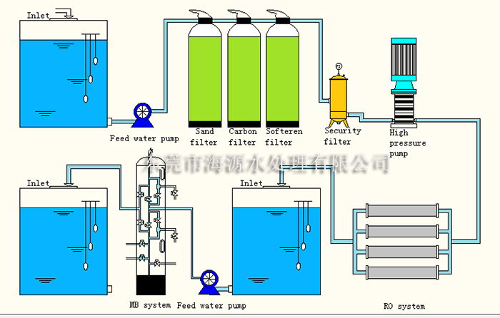 源水箱--給水泵――多介質過濾器――碳過濾器――軟水器/阻加藥――保安過濾器――高壓泵/離心泵――1級反滲透系統――混床級水泵――離子交換混床――產品水箱(適合進水TDS≤1000,出水電阻率≥5~10MΩ).