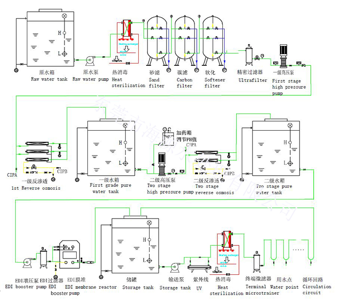 以下是預處理-反滲透-EDI連續電除鹽工藝流程圖