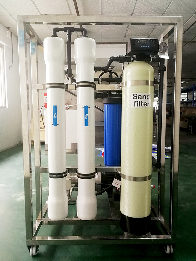 海水淡化工作原理,就是在進海水中,施以比自然滲透壓力更大的壓力,使滲透向相反方向進行,把海水中的水分子壓到反滲透膜的另一邊,變成淡水,從而達到除去水中雜質、鹽份的目的。簡單來說,海水淡化裝置是利用當今RO反滲透脫鹽技術將高濃度海水過濾低濃度淡水,供人民飲用或作工業用水。